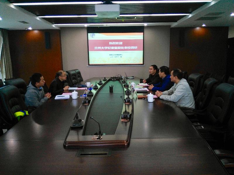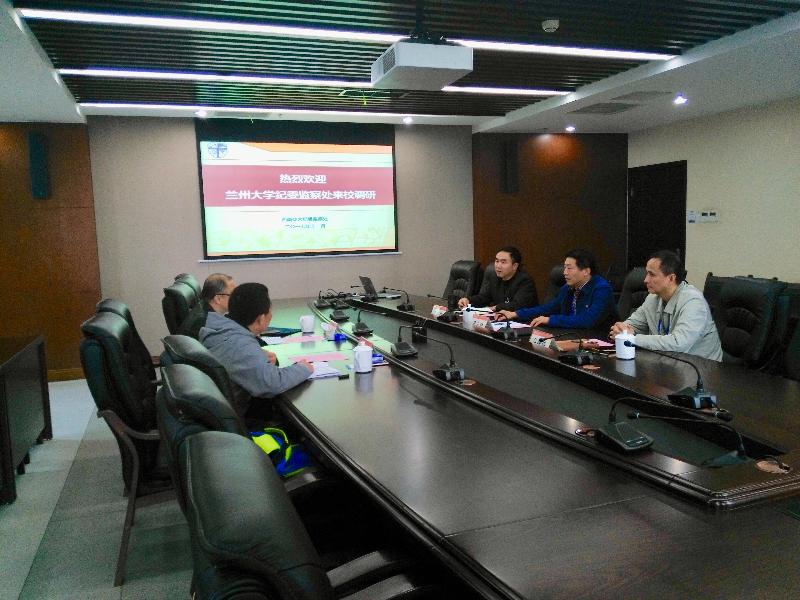2017年11月16日上午,兰州大学纪委邢耀荣副书记、监察处沈正虎副处长一行到我校调研交流。纪委葛永明副书记、监察处吴晓雄处长、周海林副处长等进行了接待,并对他们的到来表示热烈欢迎。