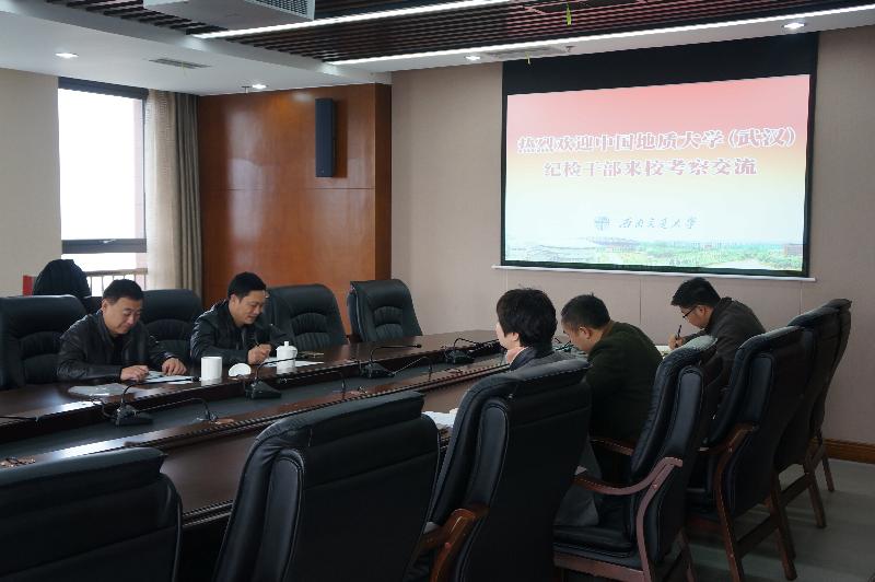 11月18日上午,中国地质大学(武汉)纪委办副主任薛宝山、纪检监察员王长虹一行前来我校调研。我校纪委办副主任张瑜、监察处副处长周海林、行政与执法监察科科长秦文臻参加了座谈会。