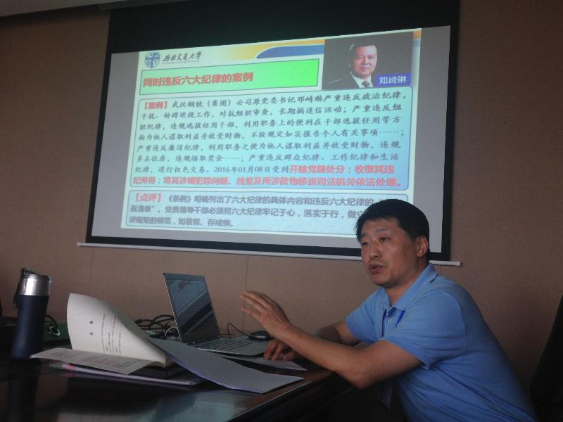 吴晓雄同志首先介绍了这次主题党日活动的总体安排,强调了主题党日活动是进行党性教育、促进工作成效的有效形式,纪委监察处、审计处、采购与招标管理办公室在日常工作中联系最为紧密,在如何“学好党章、做优工作”方面就着共同的关注点和切入点,大家在一起共同学习,交流经验,有取长补短的互补作用。接着,纪委副书记葛永明同志给大家讲解了新《中国共产党纪律处分条例》系列学习第五讲,重点讲解了对违反工作纪律行为的处分。旁征博引的案例,图文并茂的课件,生动形象的讲述,给大家留下深刻的印象。