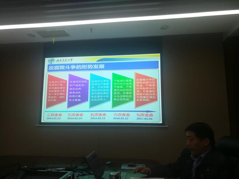 吴晓雄同志首先传达了教育部党组及学校党委学习党的十九大精神报告会相关精神和要求。随后葛永明同志以《新征程——十九大报告再学习》为题,对支部党员进行了专题辅导。葛永明同志从大会召开的时代背景、重要主题、历史定位、过去五年取得的重大成就、两个重大判断、新时代中国共产党的历史使命、坚持和发展中国特色社会主义的基本方略、新征程的重要时期和发展阶段等方面进行了深入细致的讲解,针对党的十八大以来党的反腐败斗争的形势发展,结合学校纪检监察工作监督执纪问责工作内容,葛永明同志重点谈了自己学习十九大报告的体会。最后葛永明同志对纪委办、监察处以及党支部下一阶段学习、宣传、贯彻提出了具体要求,要求坚持集中学习和自学相结合,将学习、宣传、贯彻落实十九大精神作为首要政治任务;要求要学深悟透,深刻理解习近平新时代中国特色社会主义思想,将十九大精神内化于心、外化于行;要求结合纪检监察工作实际,查找差距,补足短板,提升工作的质量和水平;要求强化使命担当,以“永远在路上”的恒心和韧劲,扎实做好监督执纪问责工作。