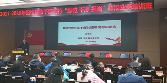 在专题培训会上,四川师范大学党委常委、副校长高中伟教授作了主题为“新时代党员领导干部理想信念和使命”的专题报告,他分别从“新时代的新使命与新梦想”、“实现中国理想必须走中国道路”、“自觉做中国特色社会主义的坚定信仰者和模范践行者”三个方面阐释了革命理想高于天,共产主义远大理想和中国特色社会主义共同理想,是中国共产党人的精神支柱和政治灵魂;坚定理想信念,是共产党人应当坚守的精神追求。他鼓励全体纪检监察干部一要树立中国特色社会主义的共同理想,做一个仰望星空的忠诚于党的共产党员;二要加强理论学习,做一个有理论素养的敢于谋事担当的共产党员;三要树立正确的人生观,做一个有良好修养的阳光干净的共产党员。