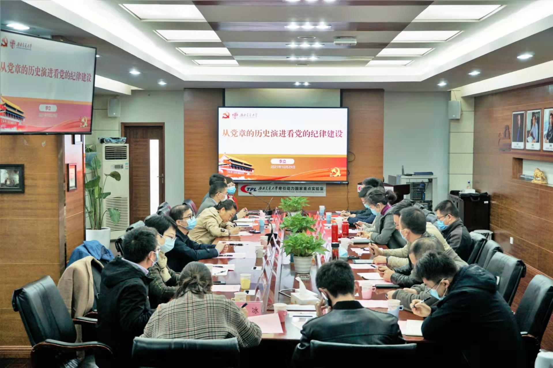 为深入开展纪检系统党史学习教育,进一步加强我校纪检干部间的交流学习,10月29日上午,我校纪检系统“片组”第一学研小组在牵引动力国家重点实验室红楼202会议室,开展了党史学习教育专题党课暨学习研讨会以及新任二级纪委书记、副书记(纪检委员)集体谈话。校纪委副书记兼党委巡察办主任李立,第一学研小组成员单位全体专兼职纪检干部,部分其他学研小组成员,2021年新任二级纪委书记、副书记(纪检委员)共同参加活动。第一学研小组组长、校机关党委纪委书记陈璐主持会议。