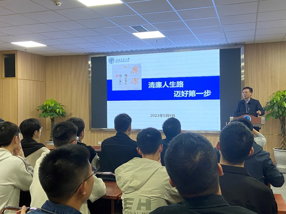 5月9日晚,学校党委副书记、纪委书记张学龙来到力学与航空航天学院,在学院学术厅为学院毕业生党员们讲授以“清廉人生路,迈好第一步”为题的主题教育专题党课。党课由学院党委书记栗民主持,学院党委副书记、纪委书记孔祥彬,辅导员张容华和2023届毕业生党员参加了本次党课学习。
