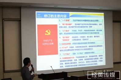 夏显波对条例修订主要内容及重要特征进行了解读,大家集体学习了《条例》,重点对政治纪律、组织纪律、廉洁纪律、群众纪律、工作纪律、生活纪律等方面进行了学习。党支部书记结合自己工作和学习,对《条例》修订的意义和重要性进行了热烈的讨论,大家一致表示,将把新版《条例》作为自身的规范和标准,把纪律转化为习惯并自觉遵守。