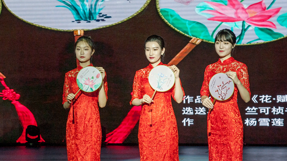 艺术设计类作品《花·赋》由竺可桢书院的三位女老师共同创作,分别在充满古典色彩的小圆扇上绘制一种花卉,并结合古诗词展现出三种花的高尚品质。杨雪莲老师绘制的《莲》“出淤泥而不染,濯清涟而不妖”;李玉梅老师绘制的《梅》“任他桃李争欢赏,不为繁华易素心”;而严翼飞老师所作的《兰》“花中真君子,风姿寄高雅”。都诠释着铮铮傲骨、廉洁清明、高洁自律的品质。