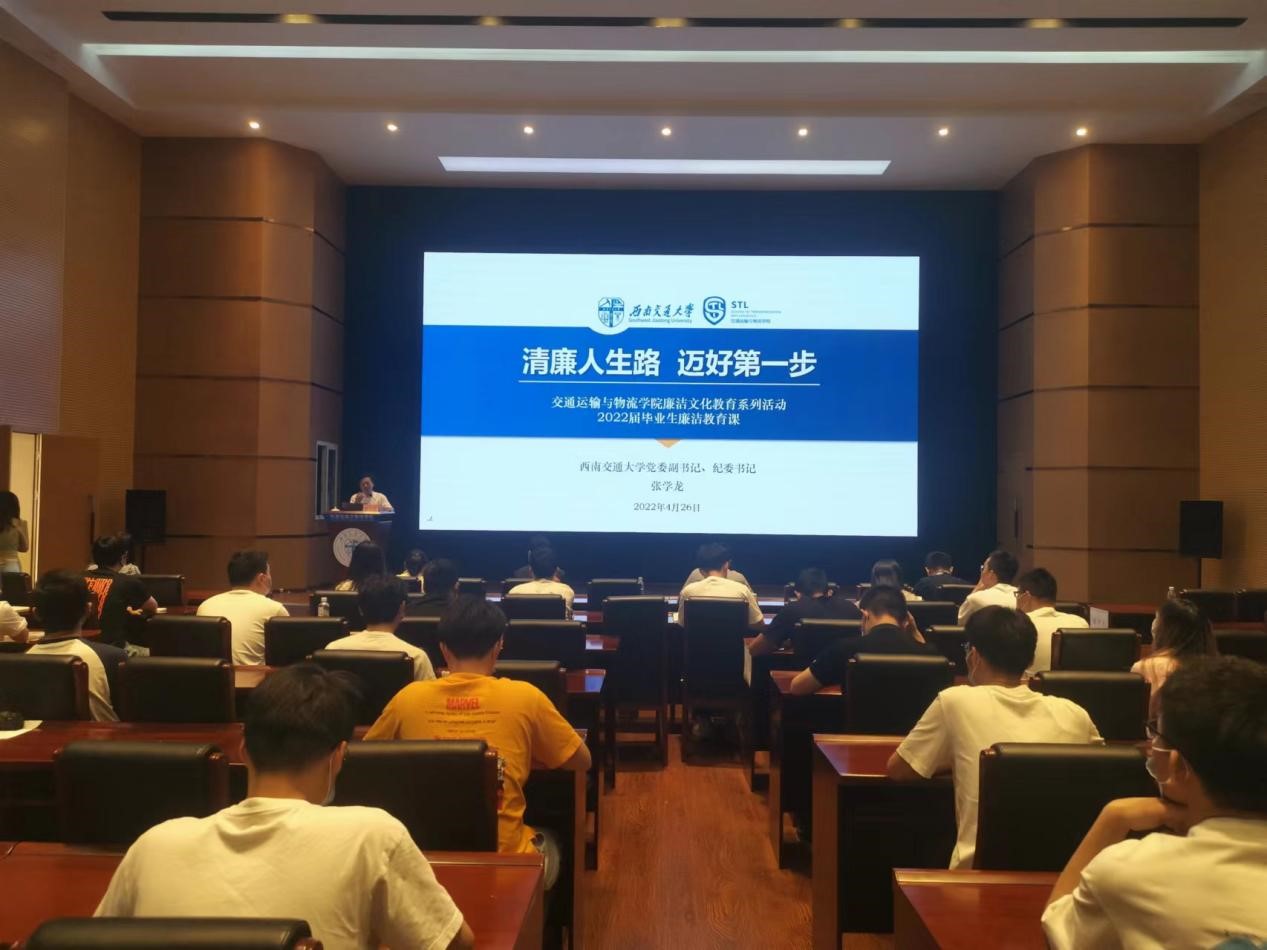 4月26日下午,交通运输与物流学院2022届毕业生专题思政课在交运楼418举办,由英国上市公司365党委副书记、纪委书记张学龙主讲,交运学院党委副书记刘继宗主持,主题为“清廉人生路,迈好第一步”。