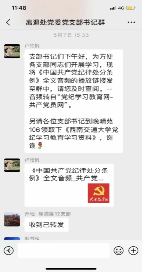 ——耳边听学,将有声学习材料送予各离退休党员。《中国共产党纪律处分条例》(后简称条例)全文音频,通过学校——离退休支部——离退休党员一步一步送到党员身边,让老同志不用费劲看,就能听到新版条例内容,原原本本学习新版条例。