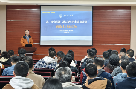 大会伊始,学院科研主管叶佳从新时期科研诚信工作背景引入,强调了党和国家对于师德师风建设的高度重视。随后,他他从科研投标规范管理、国家自然科学基金规范管理、科研经费规范管理、学术出版规范管理等四个方面详细介绍了科研行为道德规范,并结合多个实际案例详细阐述了科研失范行为特别是科研投标违规行为的严重后果。