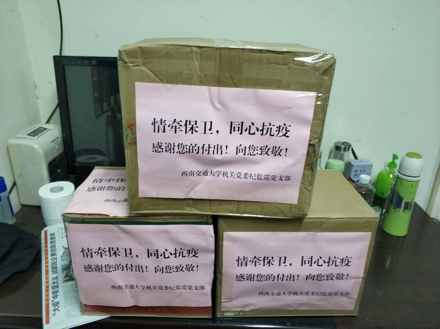 2月13日下午,在主动请缨的支部同志的护送下,第一批消毒防护物资84消毒液、消毒湿巾已经送抵保卫处,将尽快发放到一线保卫队员手中。后续,还将有一批乳胶手套送达,为他们提供安全保护。支部全体党员同志以此实际行动,支援抗疫、参与抗疫,让党旗在抗疫前线高高飘扬!