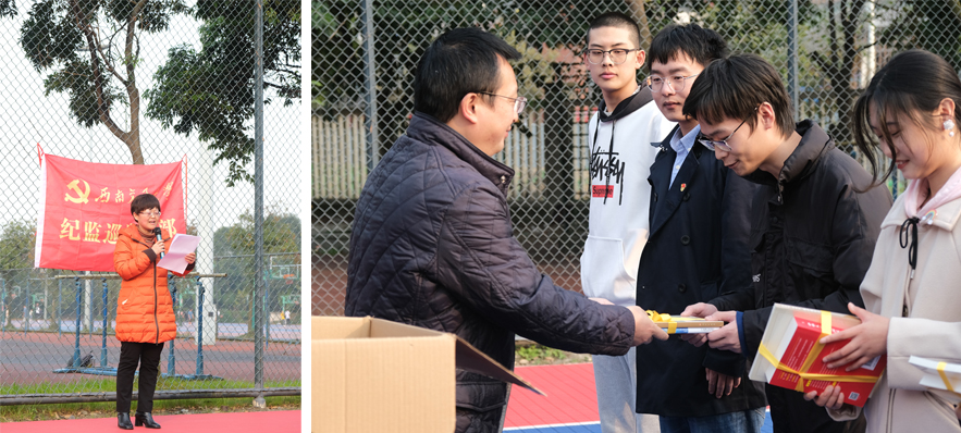 校纪委副书记兼监察处处长郝辽钢同志代表纪监巡党支部向同学们赠送书籍《共产党宣言》。郝辽钢同志勉励大家要把握在办公室助勤的机会,追求更有高度、更有境界、更有品位的人生,让清风正气、蓬勃朝气遍布校园。